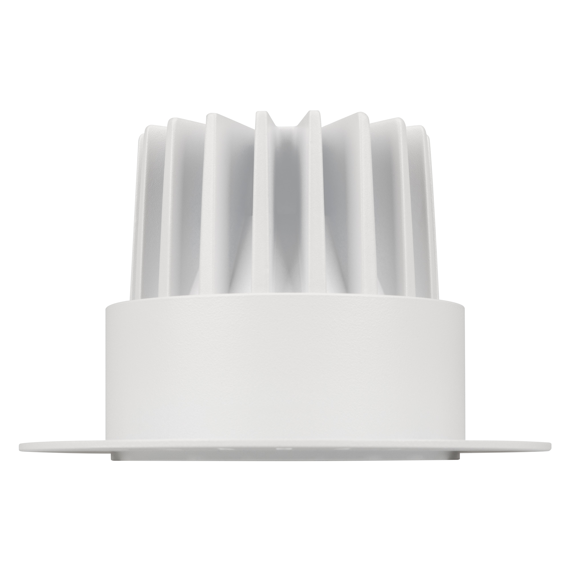 Встраиваемый безрамочный светильник под шпаклевку. Мощность 12 Вт, св. поток 946 лм, 72 лм/Вт, тёплый 3000 K, CRI>90, угол 32°, напряжение питания 230 В. Белый круглый корпус из алюминия, белый МАТОВЫЙ отражатель из PMMA, степень защиты IP20. Размер: диаметр 110 мм, высота 70 мм. Монтаж встраиваемый, установочное отверстие диаметр 85 мм. Драйвер 20-40 В, 300 мА, пульсация <2%.