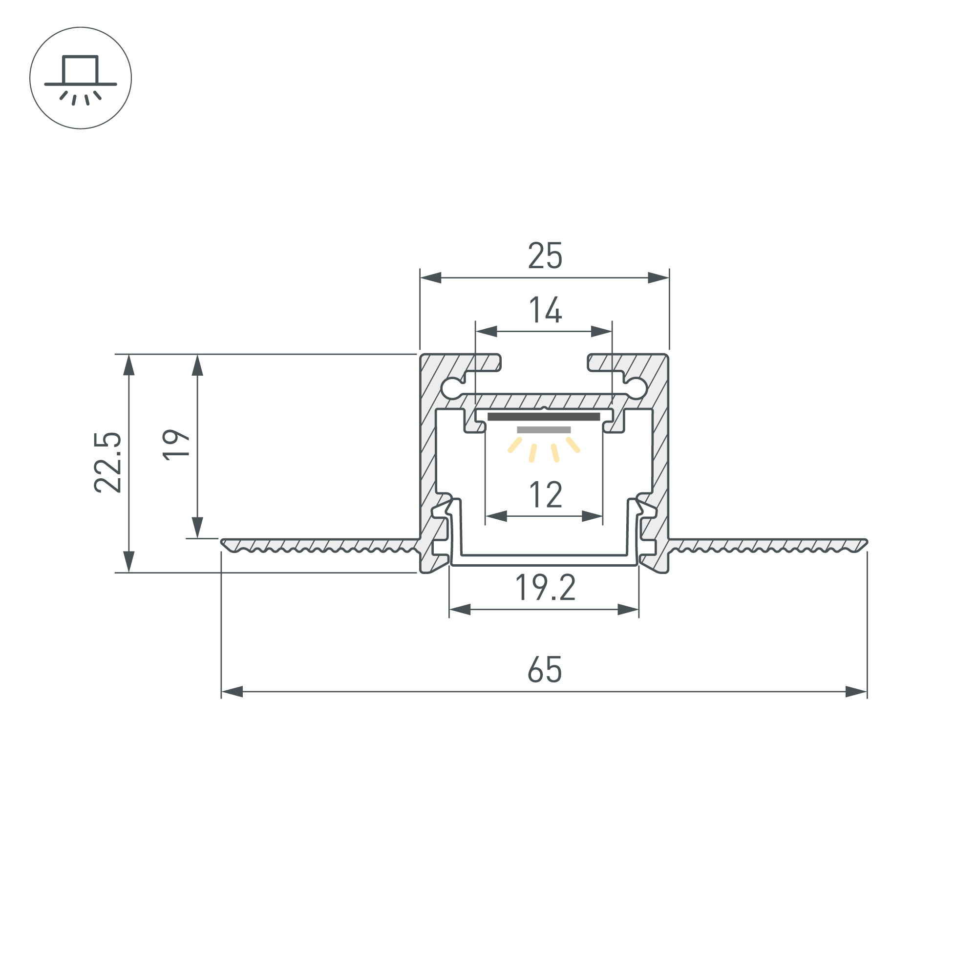 Встраиваемый профиль со скрытым фланцем под строительную отделку из алюминия чёрного цвета RAL9005 (порошковая окраска) для основной и контурной подсветки помещений. Габаритные размеры профиля составляют 2500 мм в длину, 65 мм в ширину и 22 мм в высоту. Площадка для установки светодиодных лент позволяет использовать ленту шириной до 12 мм и мощностью до 32 Вт/м. Это обеспечивает гибкость в выборе светодиодных лент и создает потрясающие световые решения.