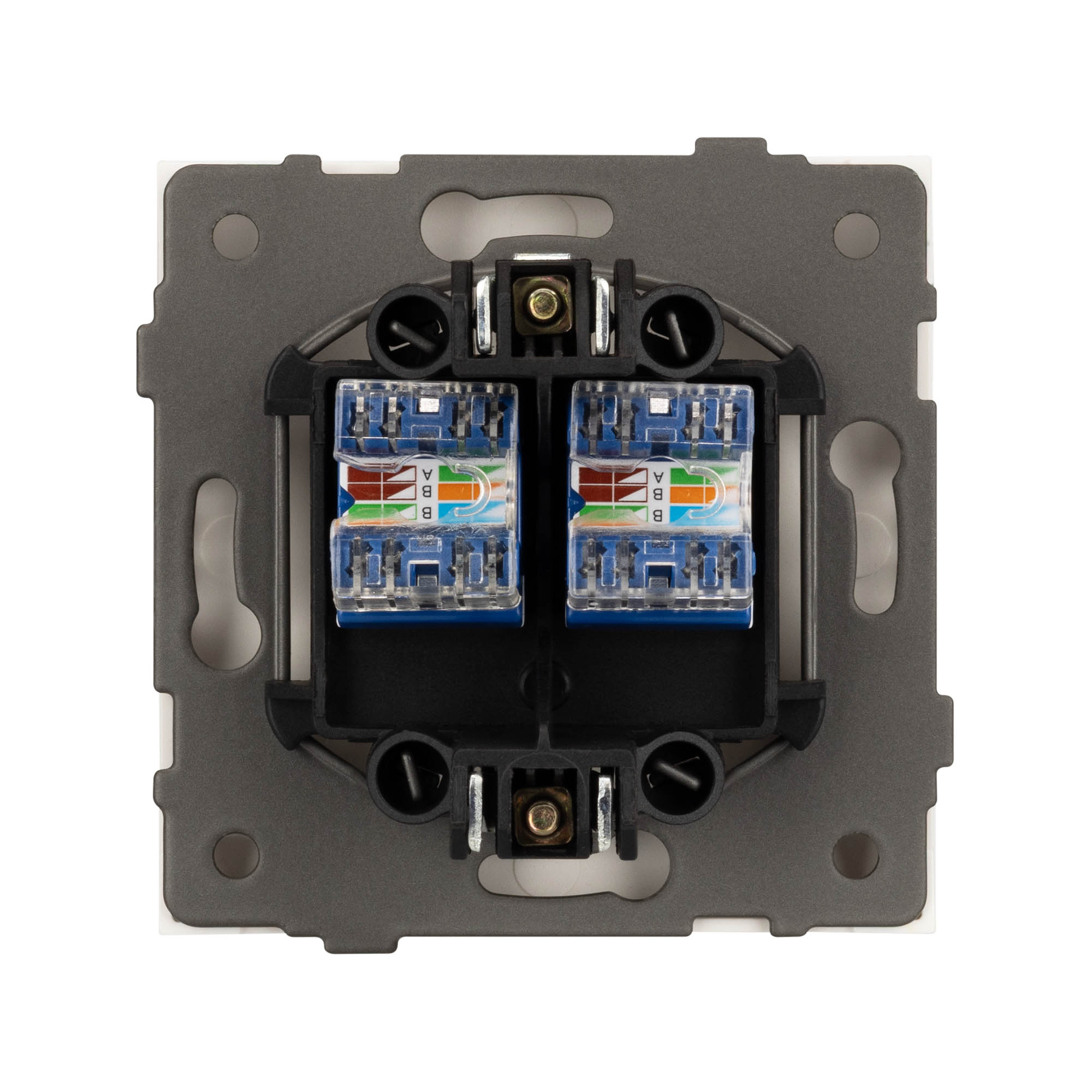 Выходной порт RJ-45 (Female) формата 8P8C соответствует категории 6 (Cat.6), что поддерживает высокоскоростные соединения до 10 Гбит/с на расстоянии до 55 метров. Откидная крышка защищает выходной порт от повреждения и загрязнения внешних контактов разъема. Контактная часть выполнена по технологии IPC (изоляционно–пробивающего контакта) с нанесением цветной маркировки схемы разводки на корпус, позволяя быстро и легко подсоединить механизм компьютерной розетки к большинству многожильных кабелей типа UTP (неэкранированные).