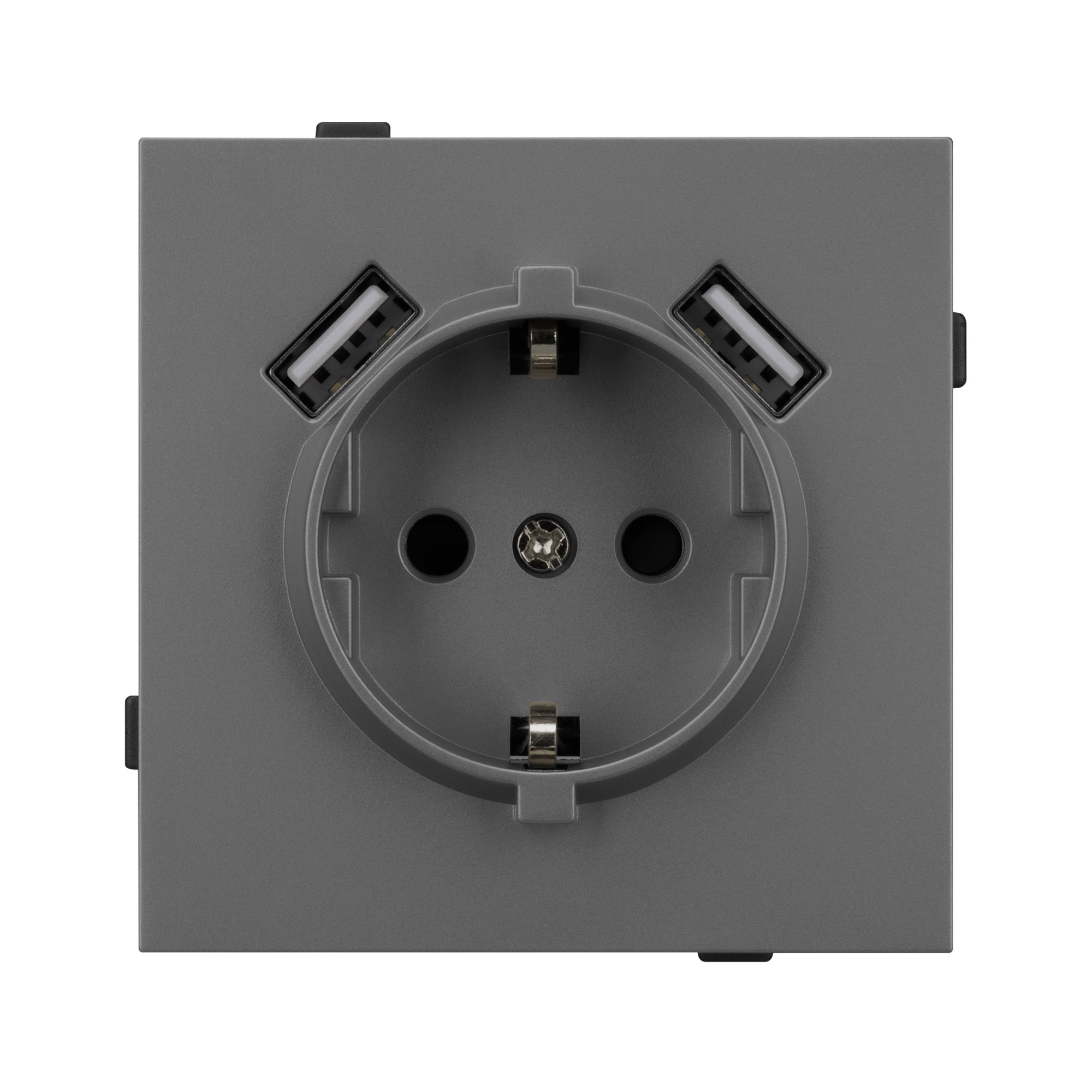 Механизм розетки с заземлением на 1 пост и 2USB Type A порта. Цвет - серый, с Soft-Touch покрытием. Без фронтальной рамки. Уровень пылевлагозащиты IP20. Розетка устанавливается в стандартный подрозетник круглого сечения диаметром 60мм. Габаритные размеры: длина 71 мм, ширина 71 мм, высота 53 мм. Гарантийный срок 10 лет.