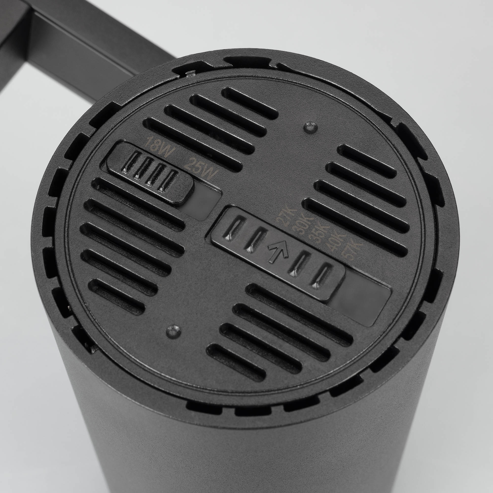 Светильник для треков/шин 4 провода, 18Вт/25Вт. Цвет свечения меняется в диапазоне 2700K/3000K/3500K/4000K/5700K (при помощи переключателя на корпусе), световой поток 1140-2075лм, регулируемый угол 20°-50°, CRI>90. Корпус круглый, металл, цвет черный, IP20. Угол наклона корпуса 90°, угол поворота корпуса 330°. Габариты LxWxH: 90х75x255мм. Размер модуля DxL: 75x165мм. Входное напряжение AC220-240V, мощность 25Вт.
