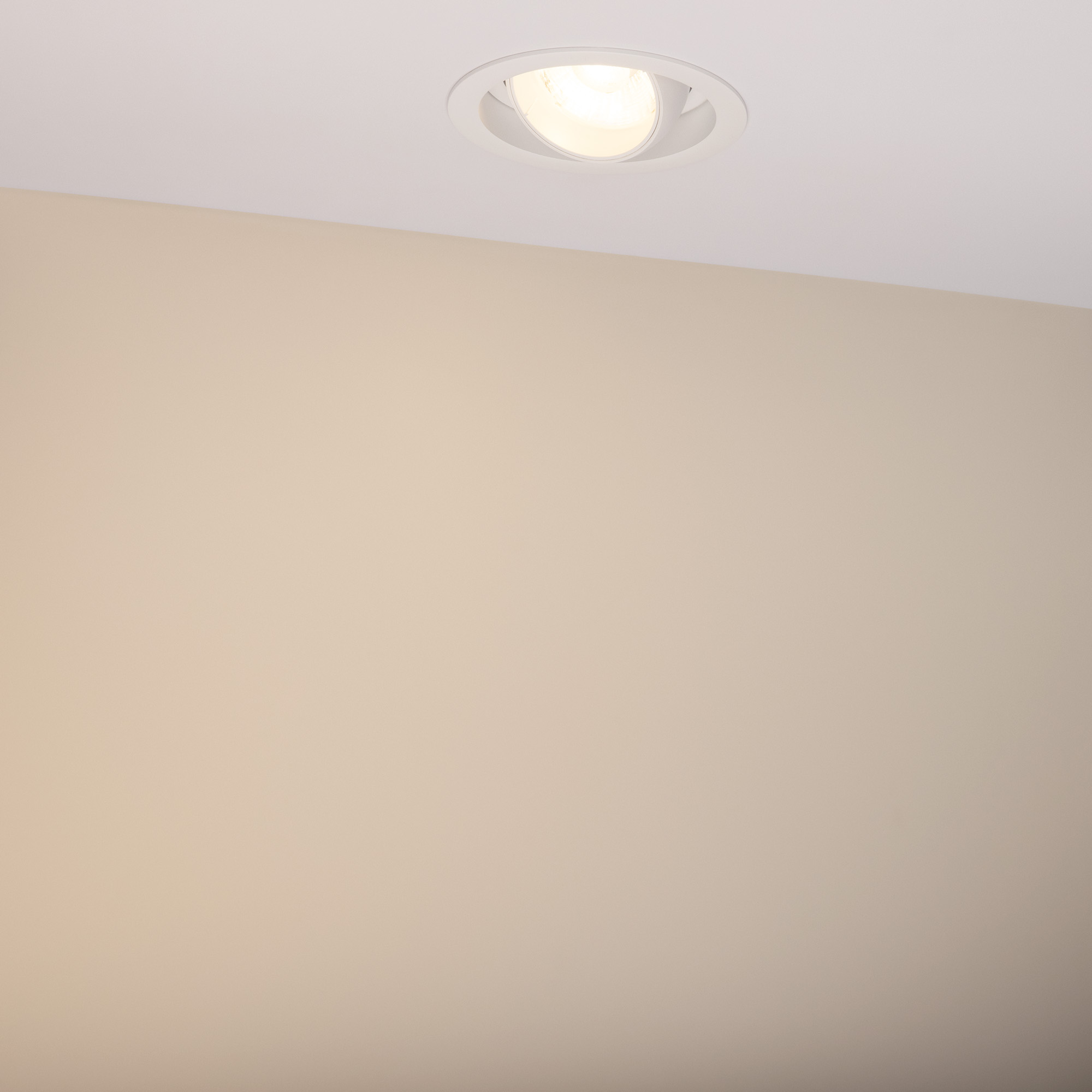 Встраиваемый карданный светильник. Мощность 30 Вт, св. поток 2650 лм, 89 лм/Вт, тёплый 3000 K, CRI>92, угол 50°, напряжение питания 230 В. Белый корпус из алюминия, белая вставка, степень защиты IP20. Размер: диаметр 135 мм, высота 125 мм. Монтаж встраиваемый, установочное отверстие: диаметр 120 мм. Драйвер 24-42 В, 750 мА, пульсация <2%.