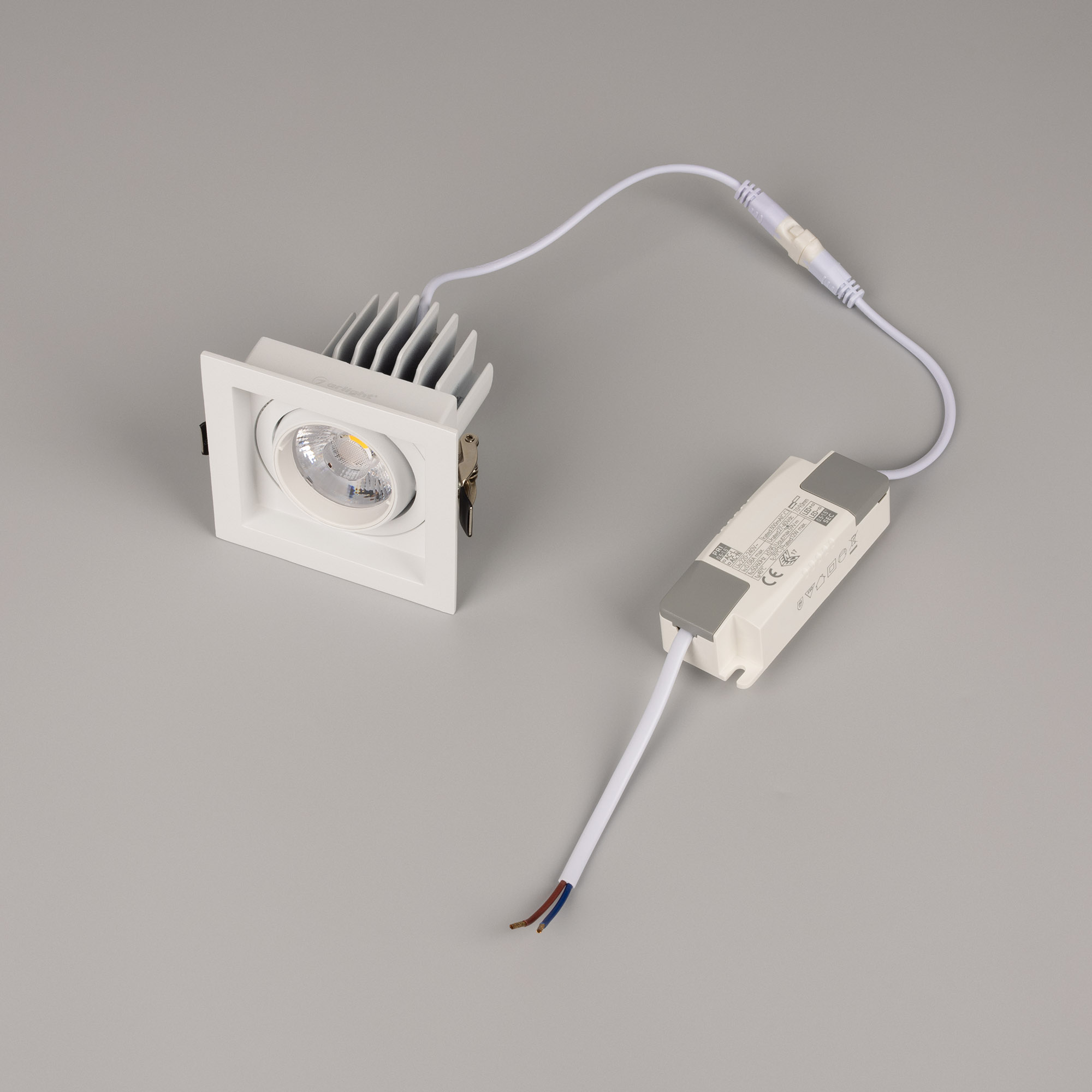 Встраиваемый карданный светильник. Мощность 12 Вт, св. поток 1318 лм, 109 лм/Вт, тёплый 3000 K, CRI>92, угол 20°, напряжение питания 230 В. Белый корпус из алюминия, белая вставка, степень защиты IP20. Размер: длина 90 мм, ширина 90 мм, высота 80 мм. Монтаж встраиваемый, установочное отверстие: длина 75 мм, ширина 75 мм. Драйвер 27-40 В, 300 мА, пульсация <2%.