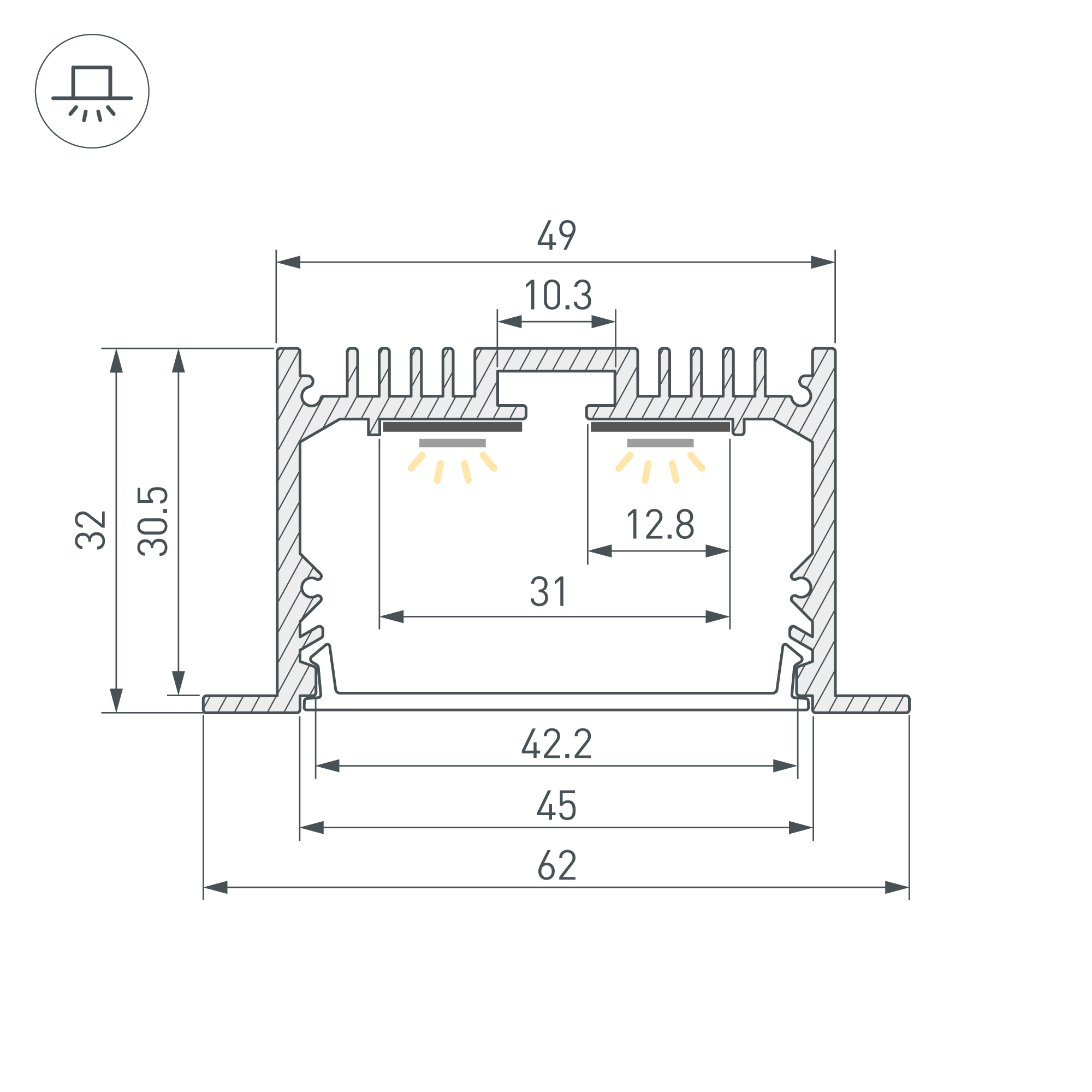 Встраиваемый профиль с накладным фланцем из анодированного алюминия для основной и контурной подсветки помещений. Габаритные размеры профиля составляют 3000 мм в длину, 62 мм в ширину и 32 мм в высоту, паз для установки 49 мм. Площадка для установки светодиодных лент позволяет использовать ленту шириной до 31 мм и мощностью до 46,4 Вт/м. Это обеспечивает гибкость в выборе светодиодных лент и создает потрясающие световые решения.