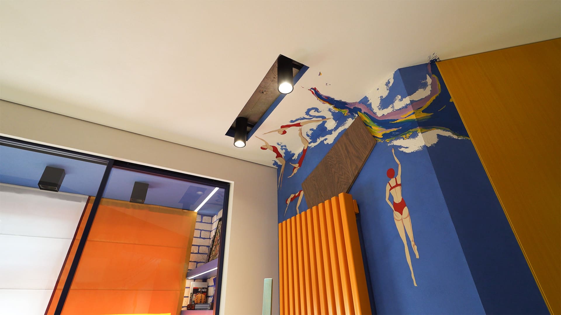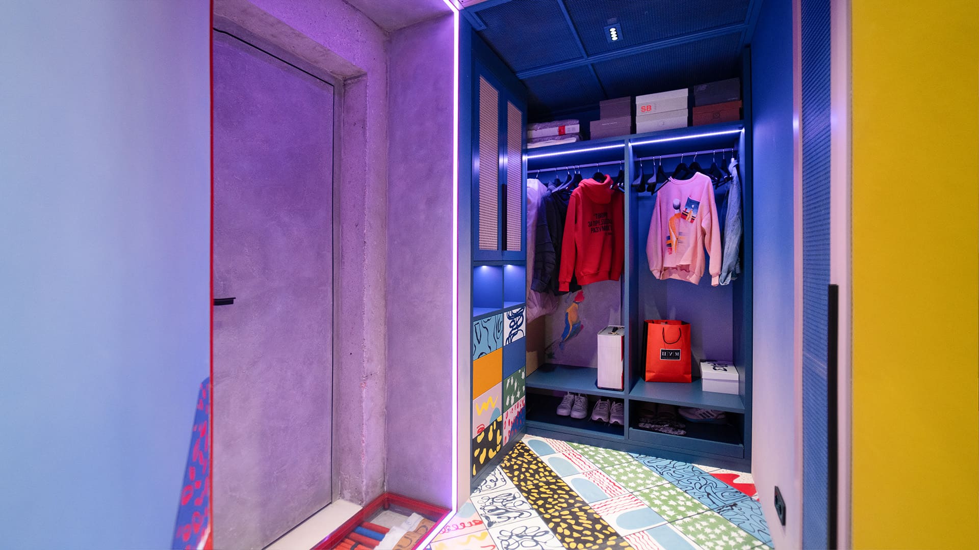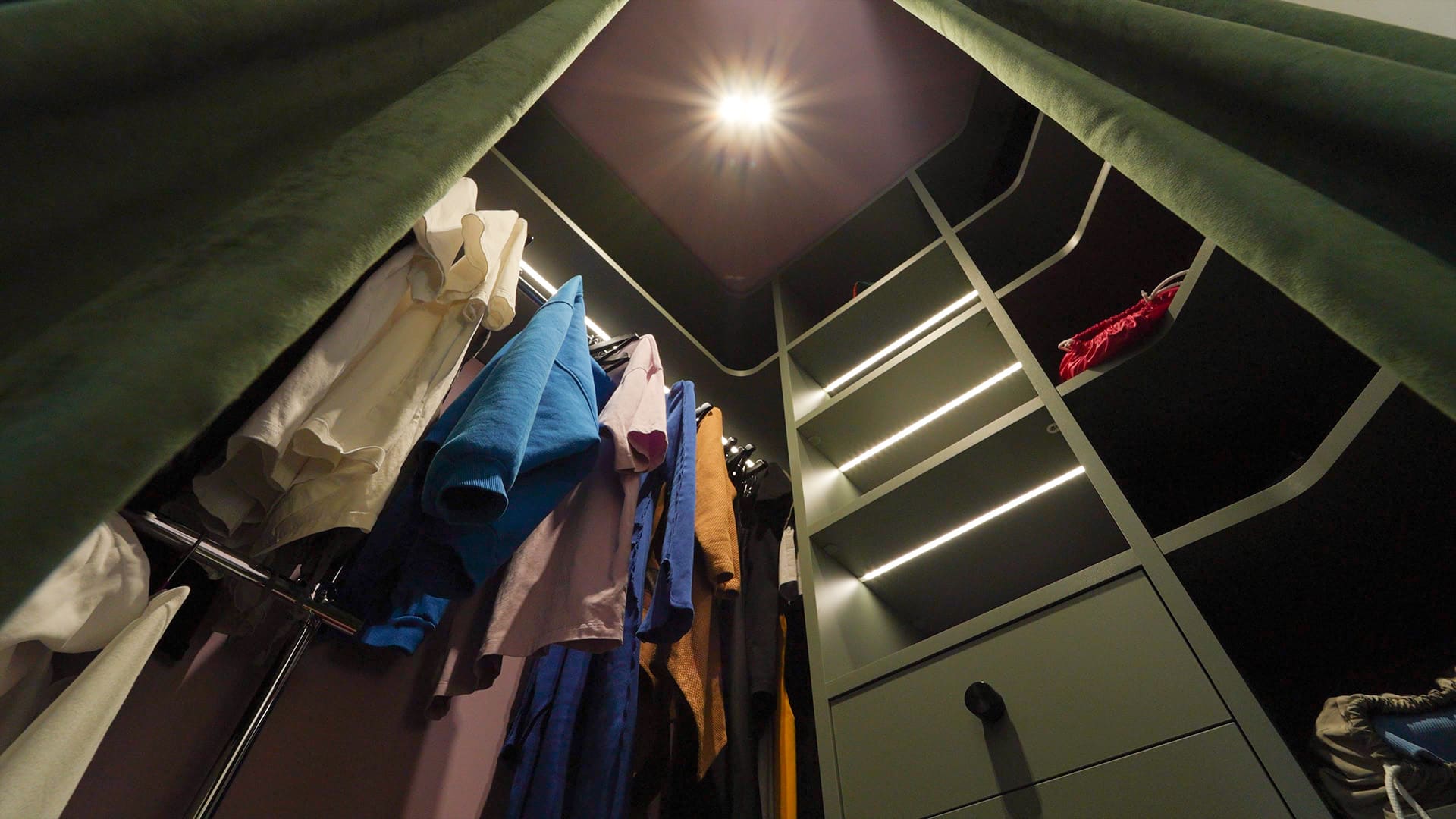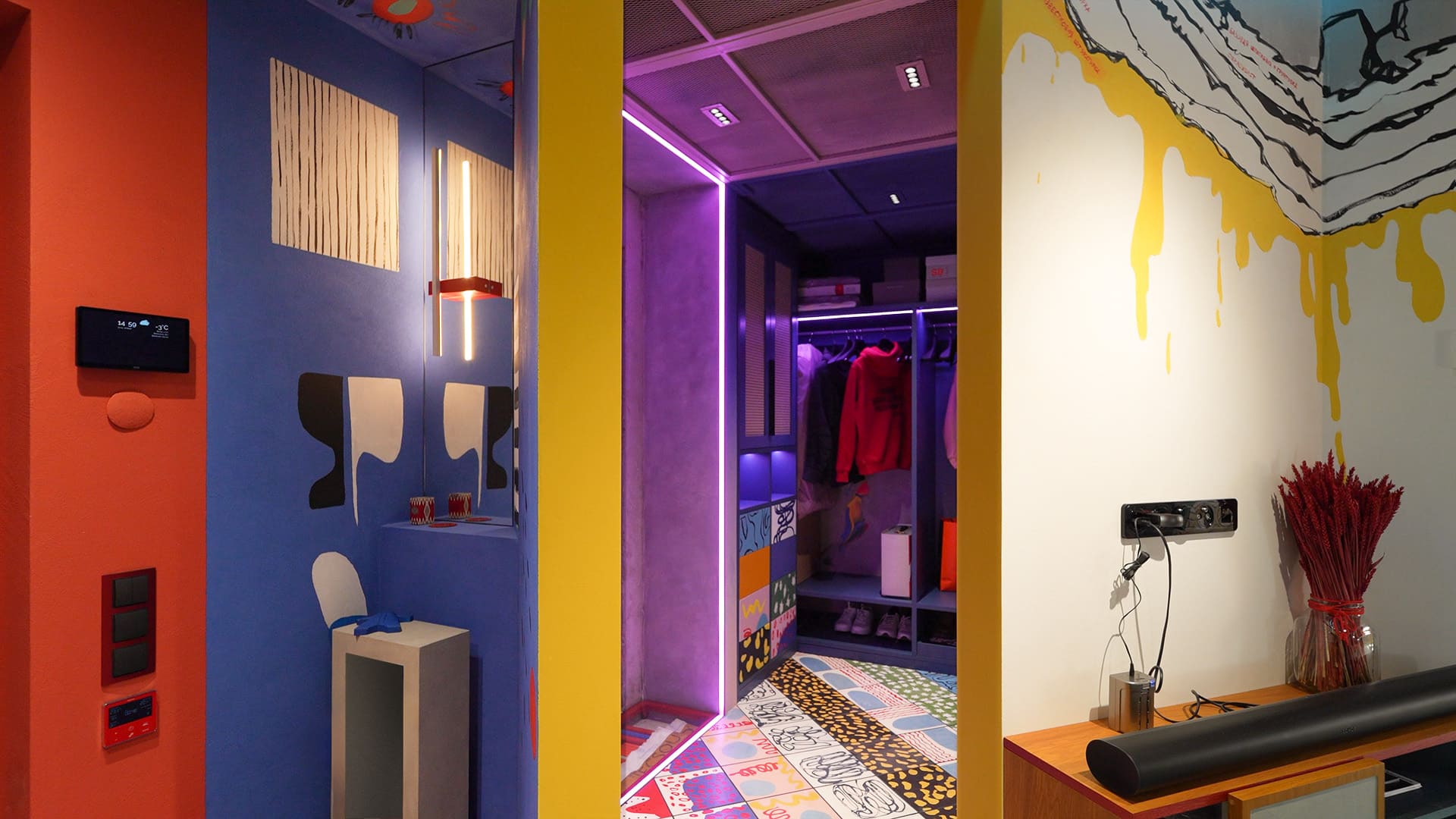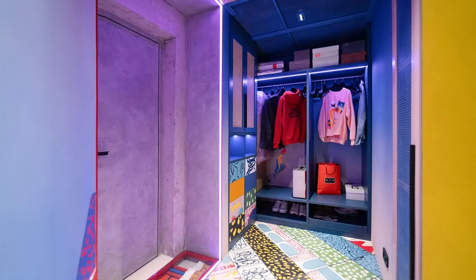 Особое внимание уделено освещению: все светильники в квартире, даже встроенные, оснащены регулируемыми модулями, которые позволяют направлять свет именно туда, где это необходимо. А светодиодные RGBW-ленты добавляют яркие акценты и создают настроение, подчеркивая красоту цветного интерьера.