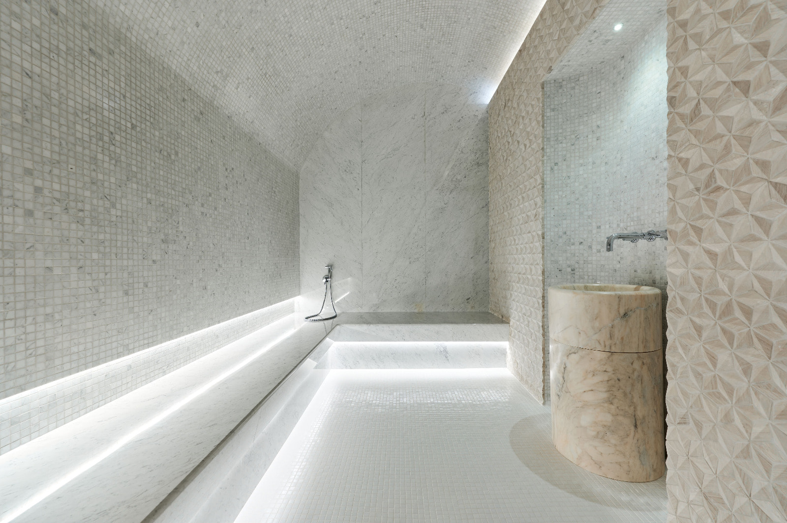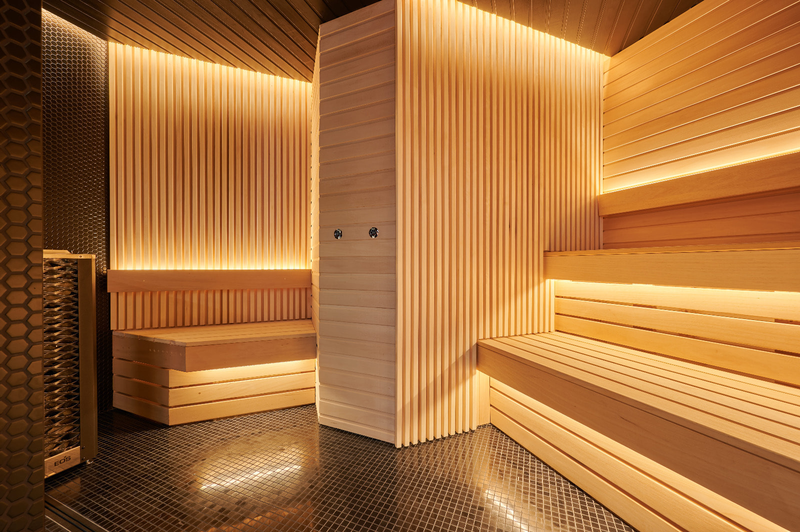 Еще одно особое пространство в фитнес-центре — термальные SPA-зоны. Для освещения финской сауны была использована герметичная светодиодная лента со степенью пылевлагозащиты IP68 и широким диапазоном рабочих температур. Умеренная яркость ленты органично рифмуется с деревянной отделкой, создавая расслабляющую и уютную атмосферу. Интерьер традиционного хаммама выполнен в аутентичном восточном стиле в светлых тонах. Подсветка белого цвета свечения подчеркивает легкую цветовую гамму и создает ощущение чистоты.