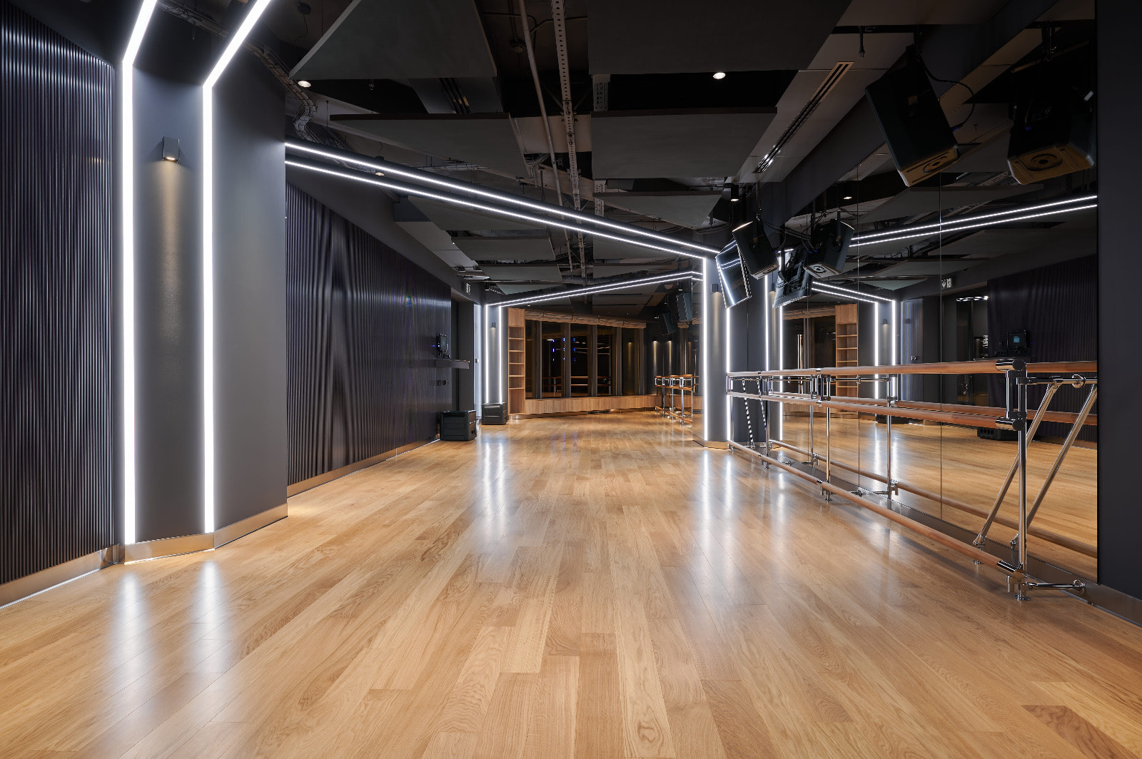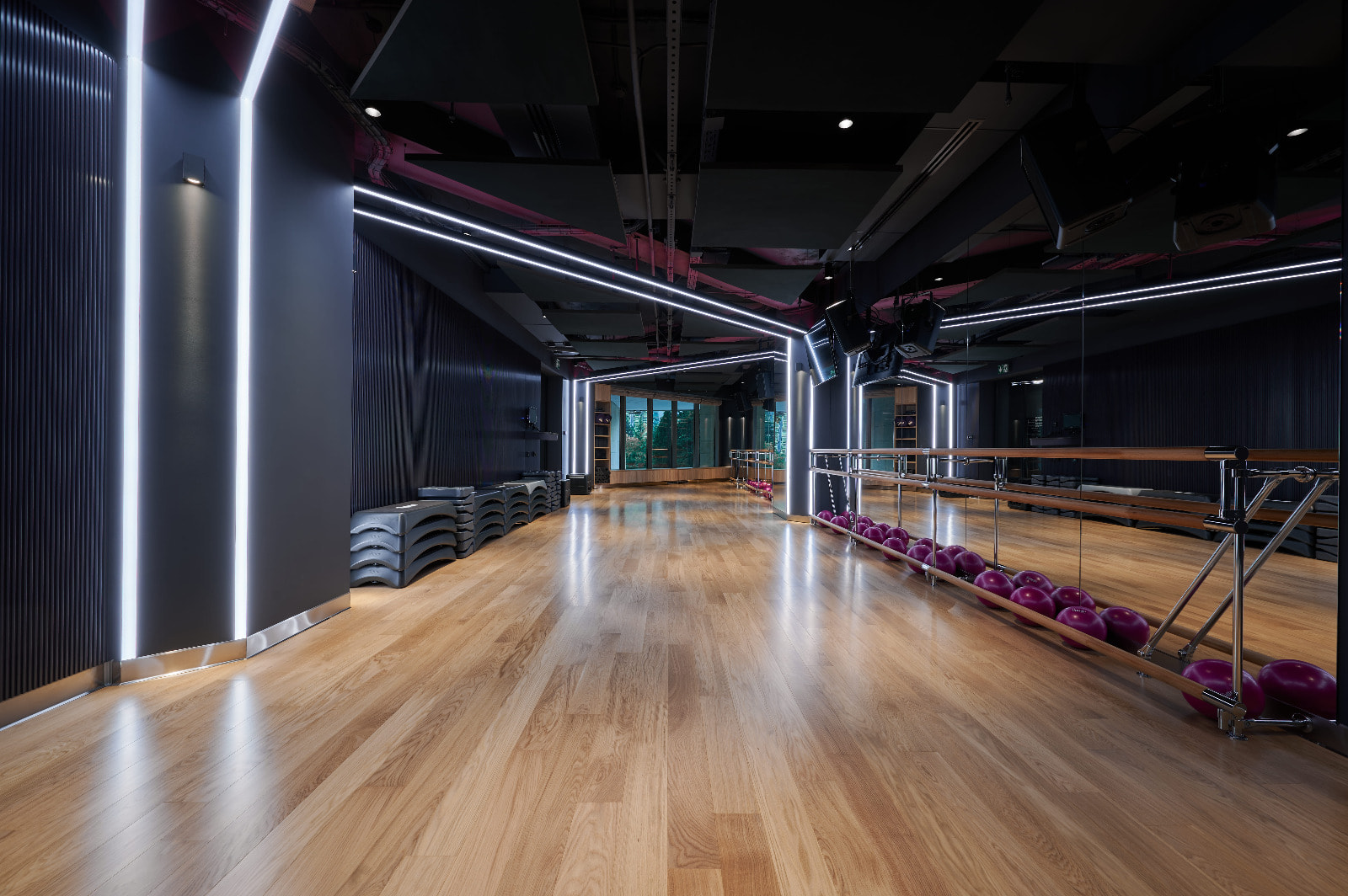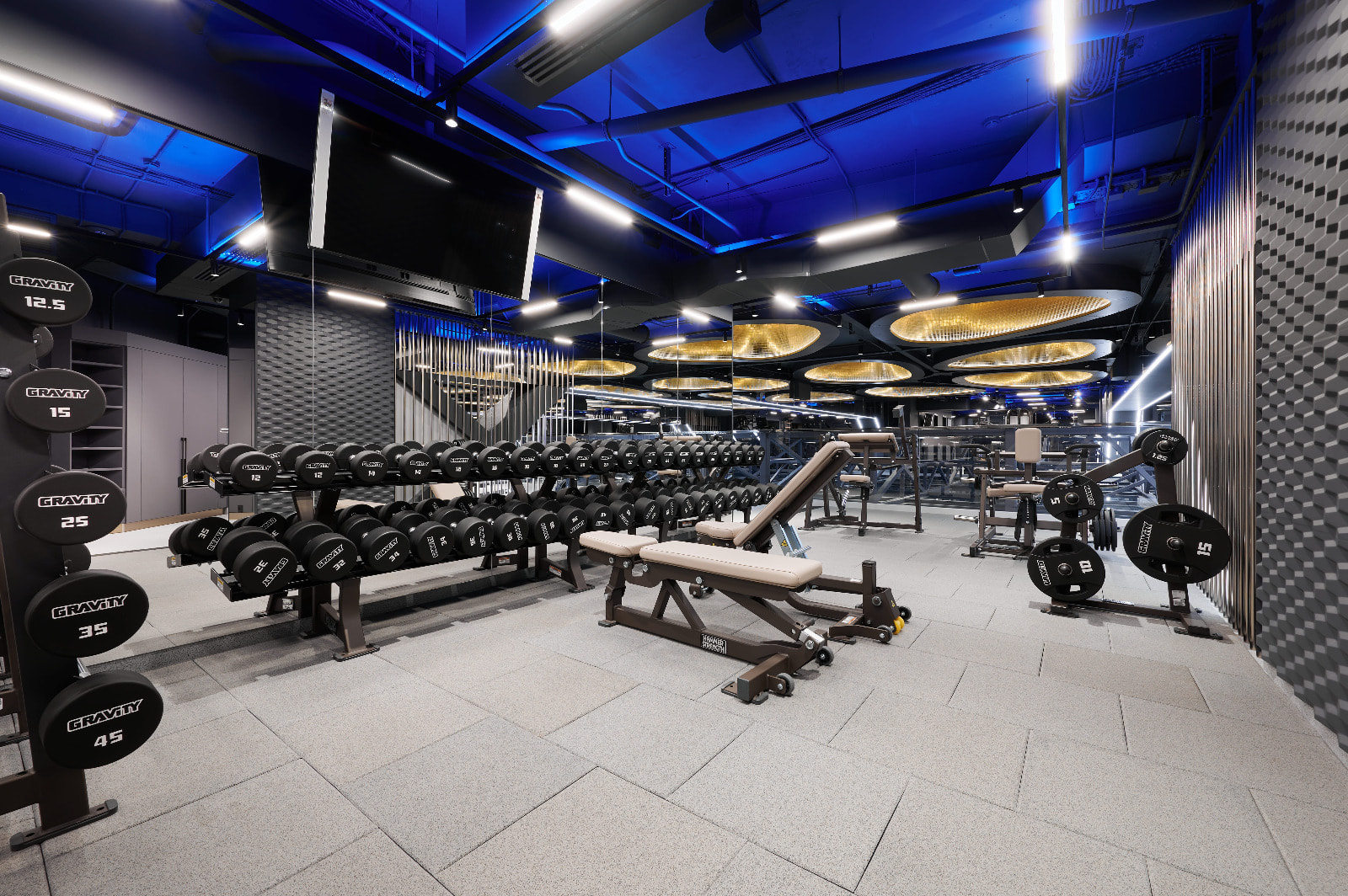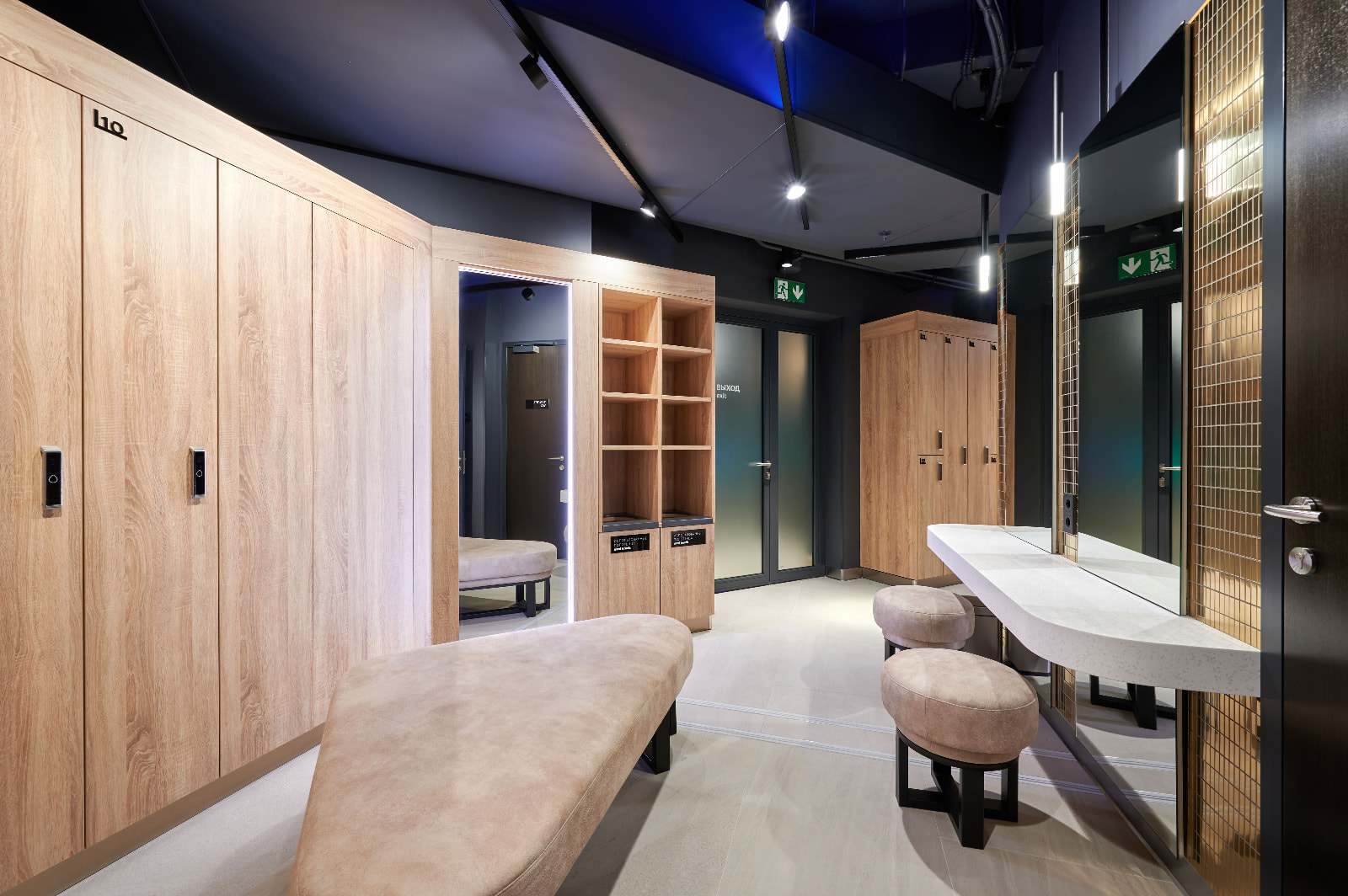 Просторные и стильные тренажерные залы оборудованы новейшей техникой для эффективных и безопасных тренировок. Особую атмосферу в зале создает тщательно продуманное освещение. Оно не только не мешает во время тренировок, но и привносит в пространство футуристические мотивы. Подсветка из линий света холодного белого и синего цветов задает мотивирующий настрой, в то время как золотистая инсталляция на потолке в свете гибкого неона теплого свечения является олицетворением премиальности. Стильные и уютные раздевалки также оборудованы RGB-подсветкой, которая эффектно направлена на открытые потолочные коммуникации. Зеркала подсвечиваются вертикальными линиями света дневного белого свечения, которое лучше всего передает естественные оттенки кожи.