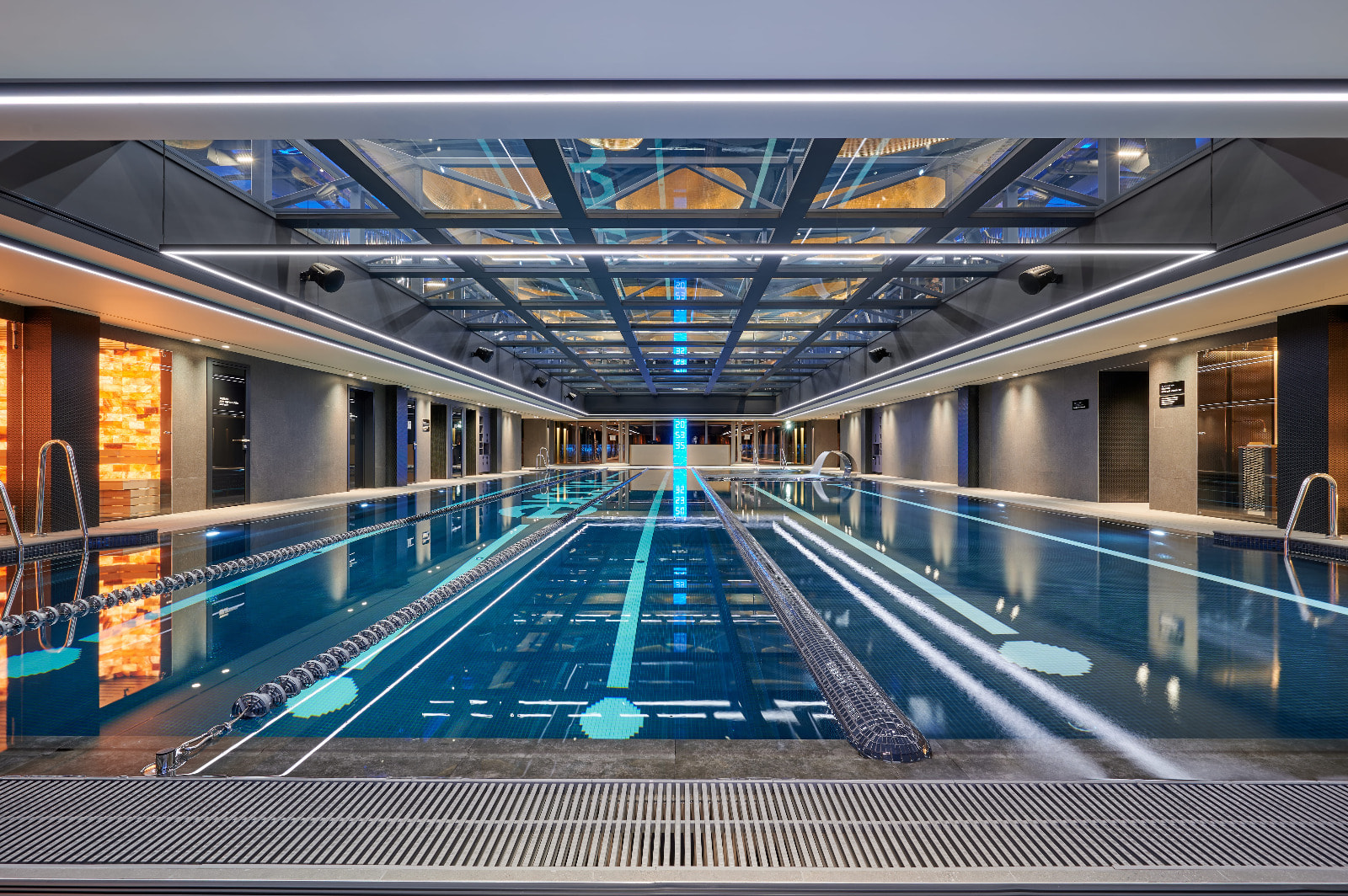Визитная карточка фитнес-центра — 25-метровый бассейн, который расположен на нижнем этаже двусветного пространства, разделенного стеклянной крышей с перекрытиями.