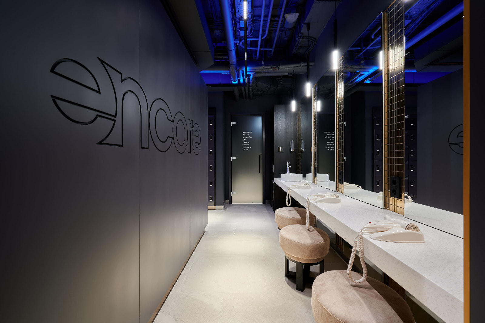 Фитнес-центр премиум-класса Encore Fitness состоит из нескольких этажей и включает в себя бассейн, термальные SPA-зоны, тренажерные залы, а также зал для занятий боевыми искусствами. Индивидуально для каждой зоны было разработано освещение с учетом всех нюансов проводимых в них активностей.