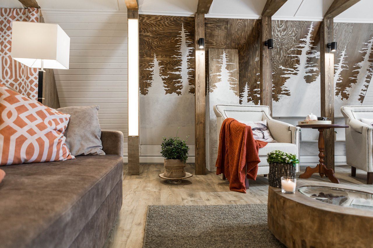 Новые идеи в телепроекте "Фазенда" на мансарде в 42 квадратных метра появилась лесная гостиная. На стене – лес еловый. Есть даже пенек. Перегородка - с осиновой рощей… Дерево, камень, камин. Почти классическое шале. Освещение в гостиной реализовано различными светодиодными светильниками.