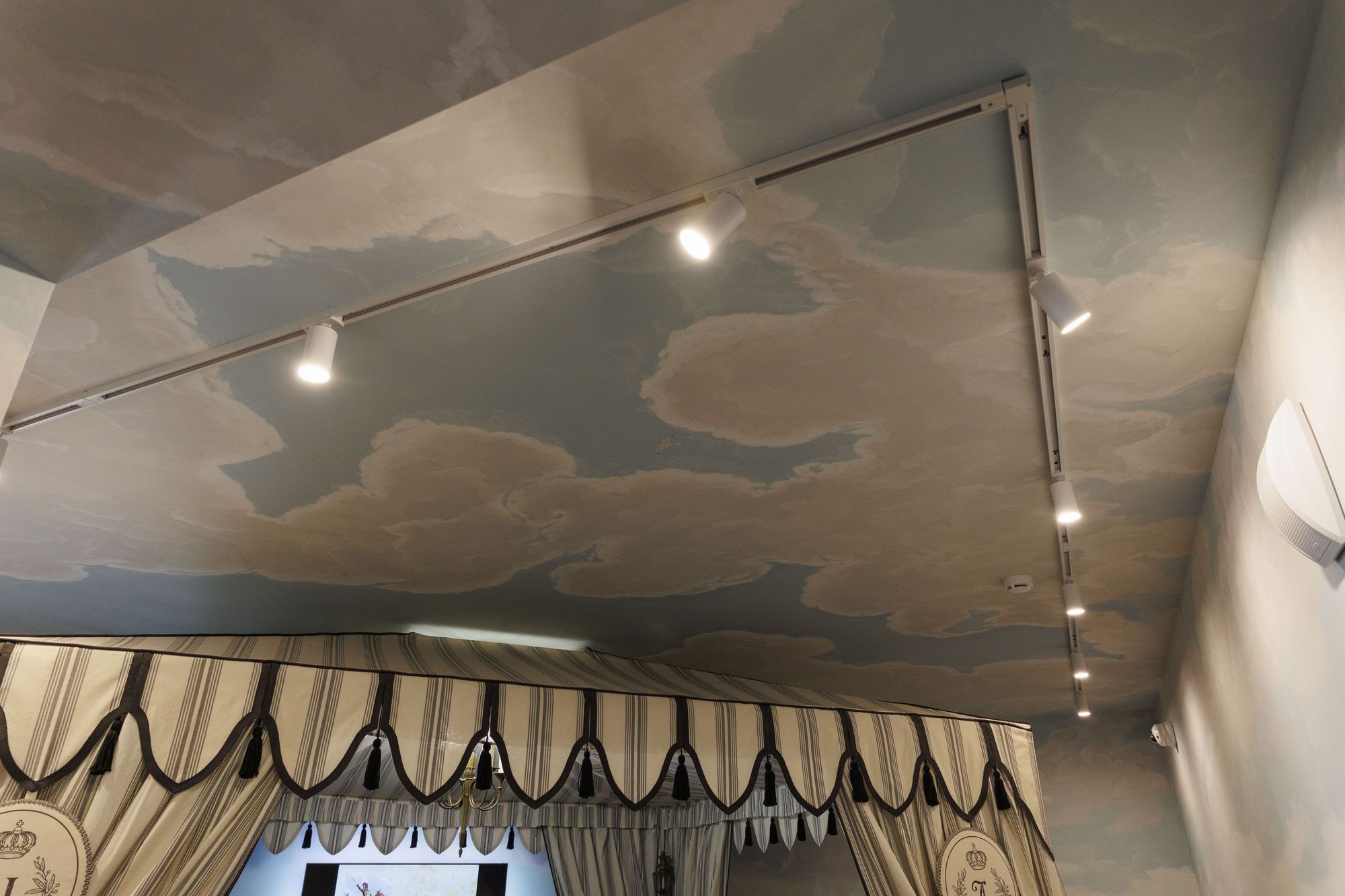 Чтобы ничто не мешало посетителям ощутить себя во дворце наполеоновской эпохи, для освещения были использованы трехфазные трековые светильники GELIOS. Аккуратные цилиндрические светильники и изящные треки не перегружают пространство, а белый цвет оборудования помогает ему слиться с поверхностью потолка. Треки установлены на подвесы, благодаря чему потолок выглядит воздушно на контрасте с массивной экспозицией.