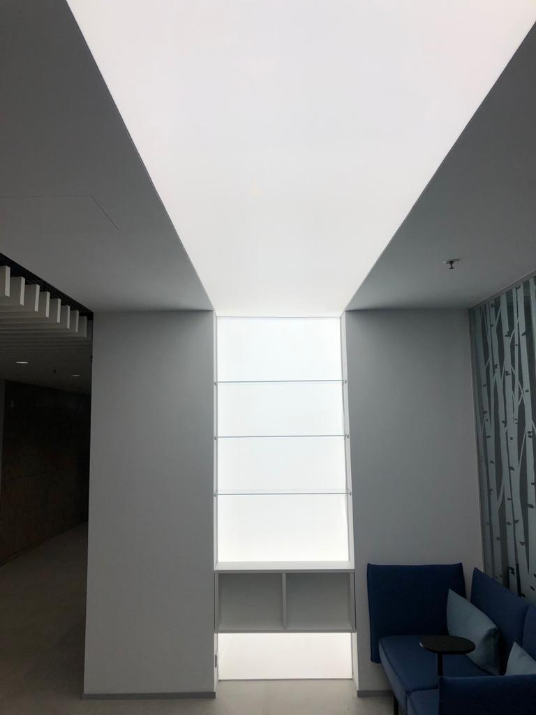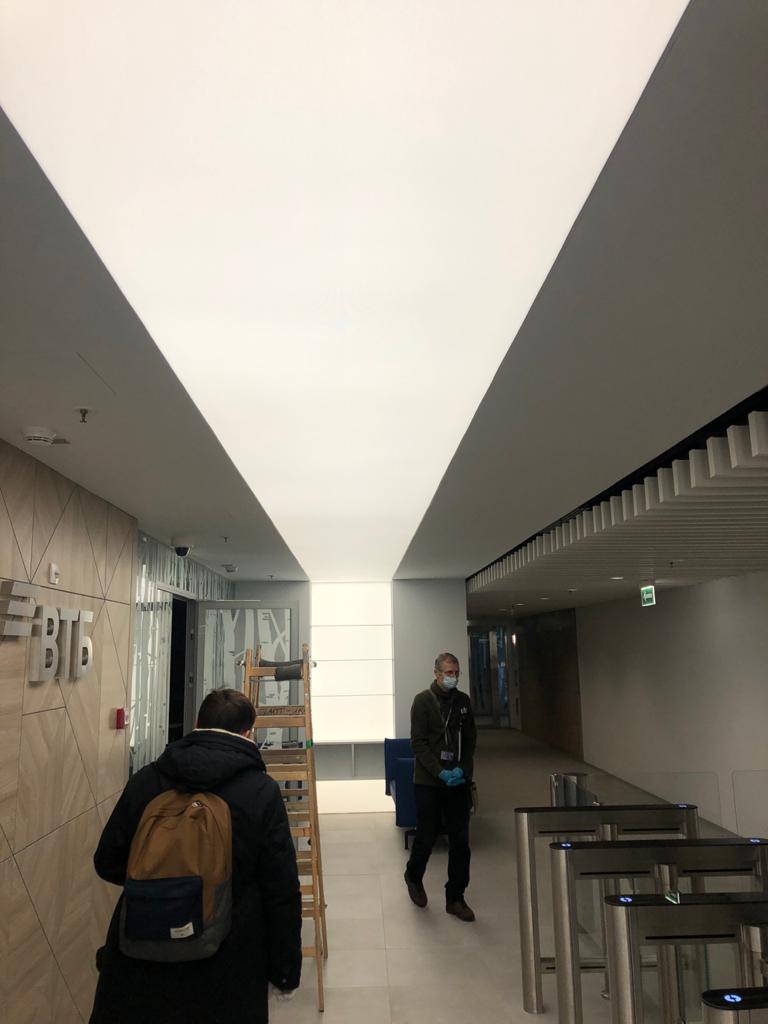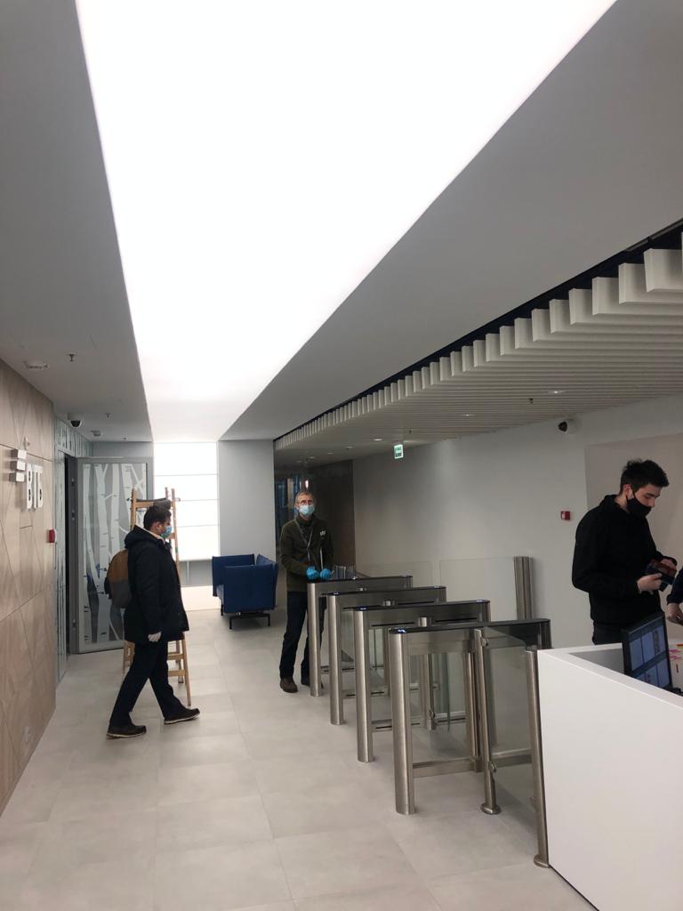 Создание масштабного светового полотна с MIX-управлением по протоколу DALI от Arlight. Потолочный светильник выполняет роль полноценного основного освещения. Предусмотрена возможность изменения цвета свечения: от теплого до холодного белого, для регулировки используется настенная панель. Мягкое свечение заполняет все пространство, использования матового рассеивателя позволяет скрыть видимость точек светодиодов. В результате освещение офиса получилось комфортным, в меру ярким и приятным для глаз.