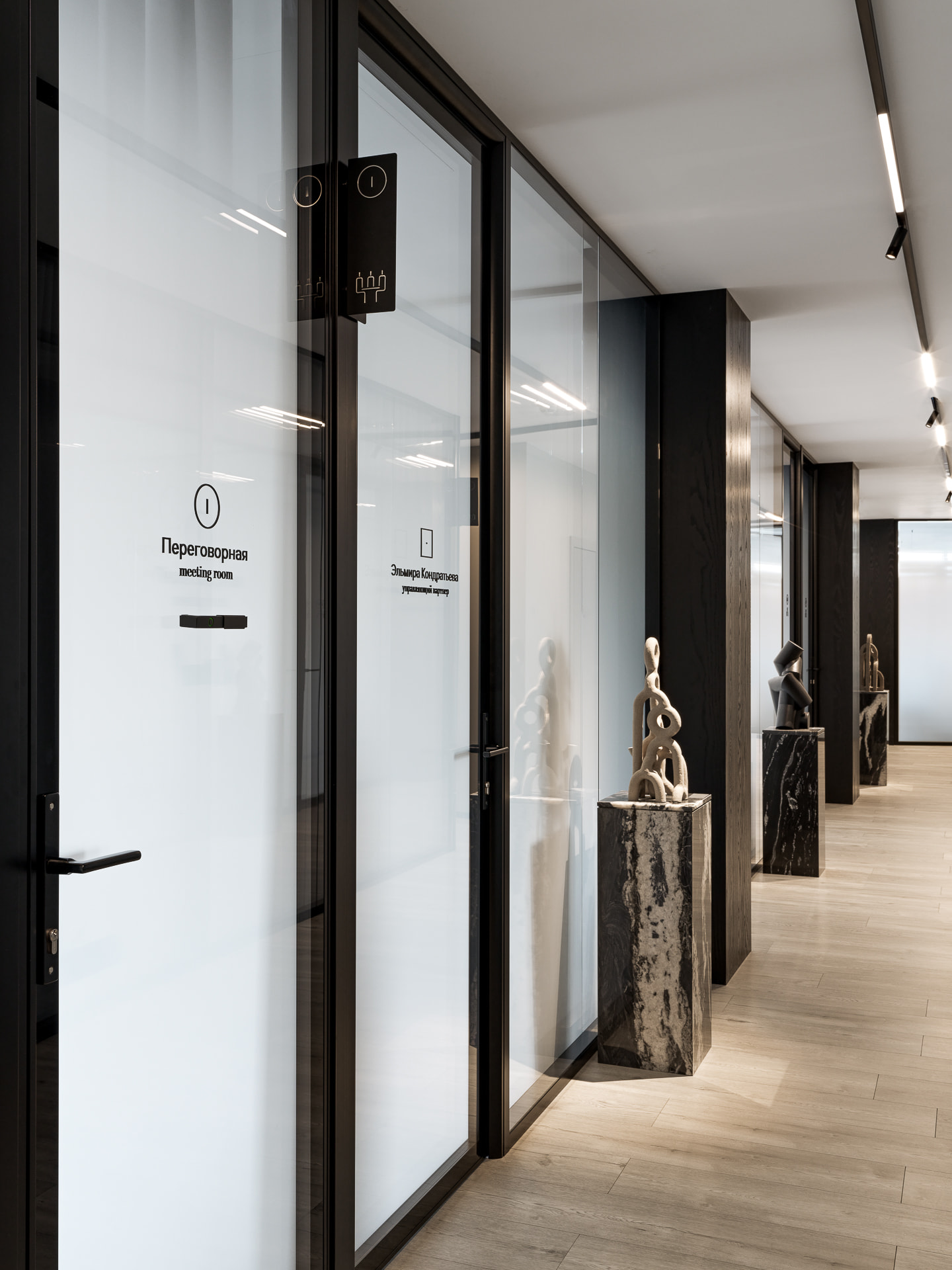 Задача: спроектировать дизайн строгого, элегантного и технологичного офиса, подчеркнуть статусность компании.