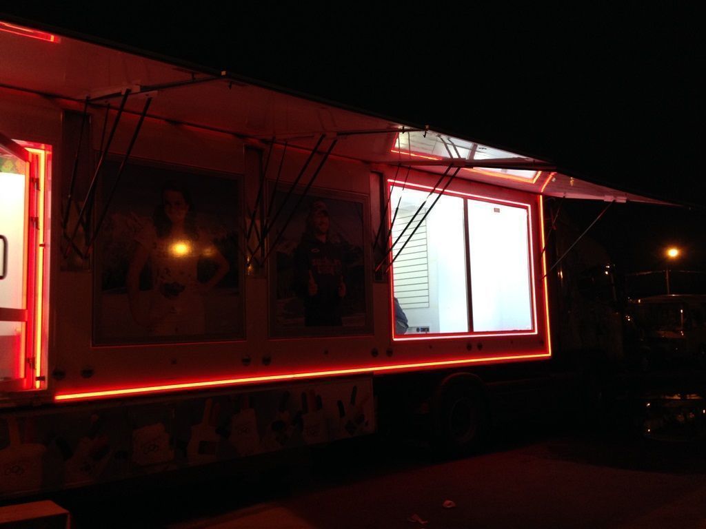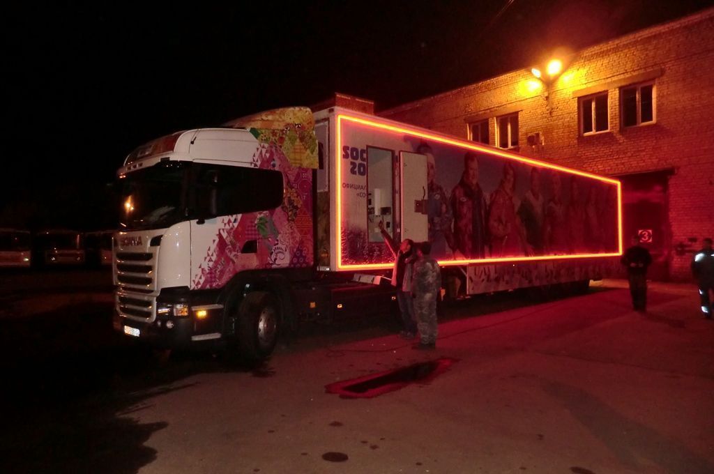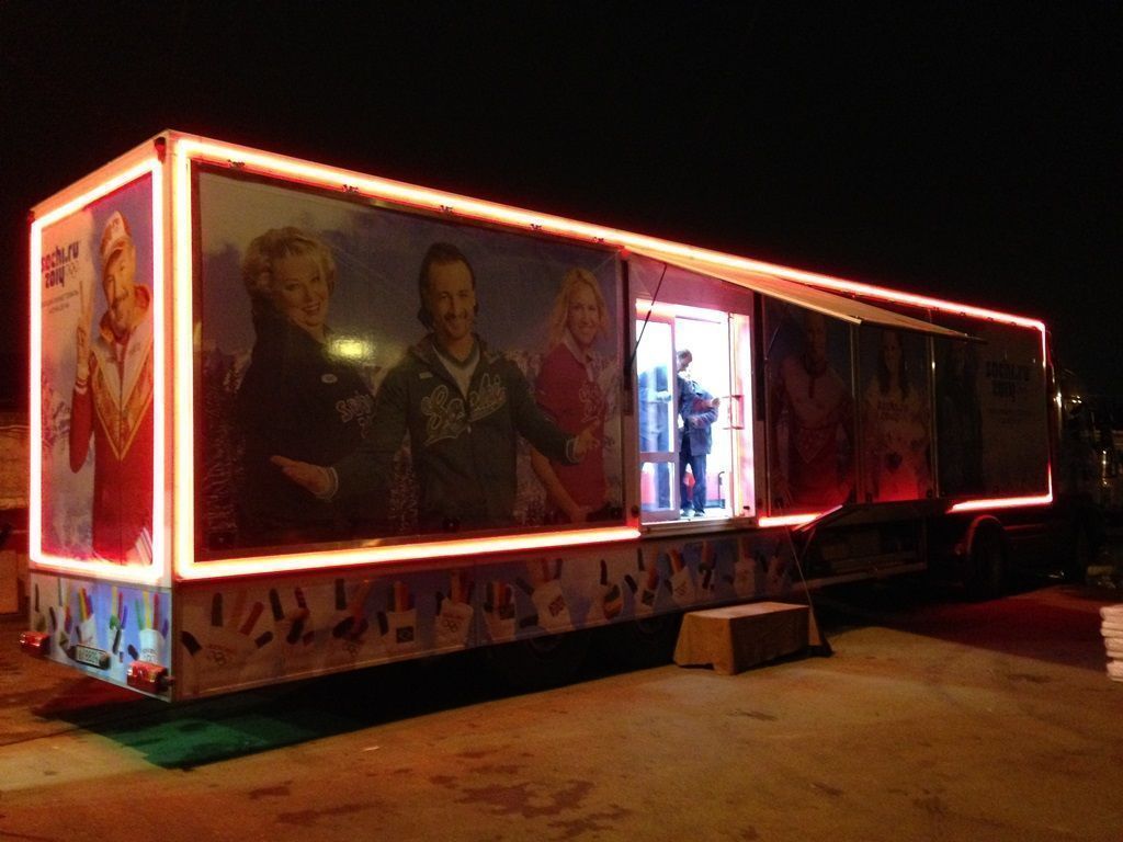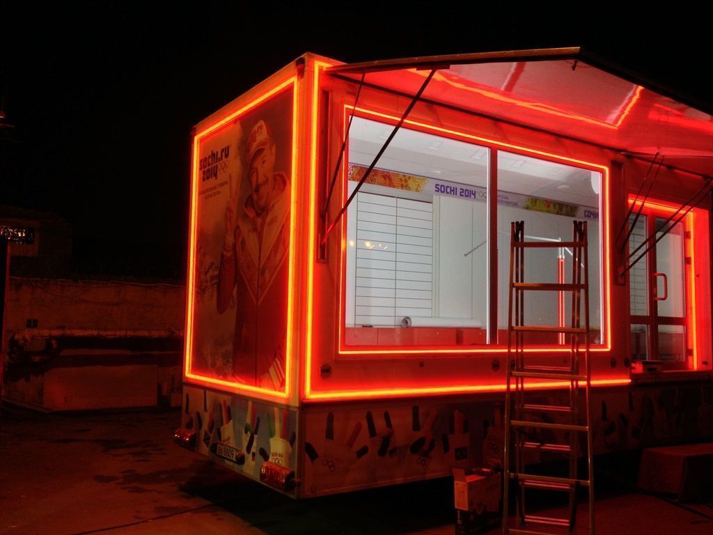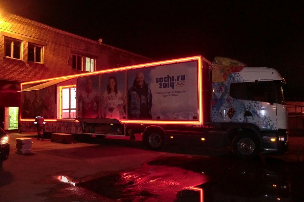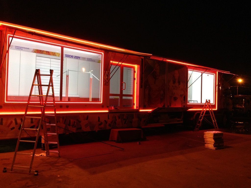 Светодиодная подсветка была установлена на тягач и прицеп, в котором оборудован магазин товаров с символикой Олимпийских игр Сочи 2014. Снаружи прицеп был выделен контурной подсветкой, выполненной при помощи светодиодной ленты arlight®. Светодиодная лента установлена в алюминиевый профиль arlight® с матовым экраном, создающим эффект сплошной световой линии.
