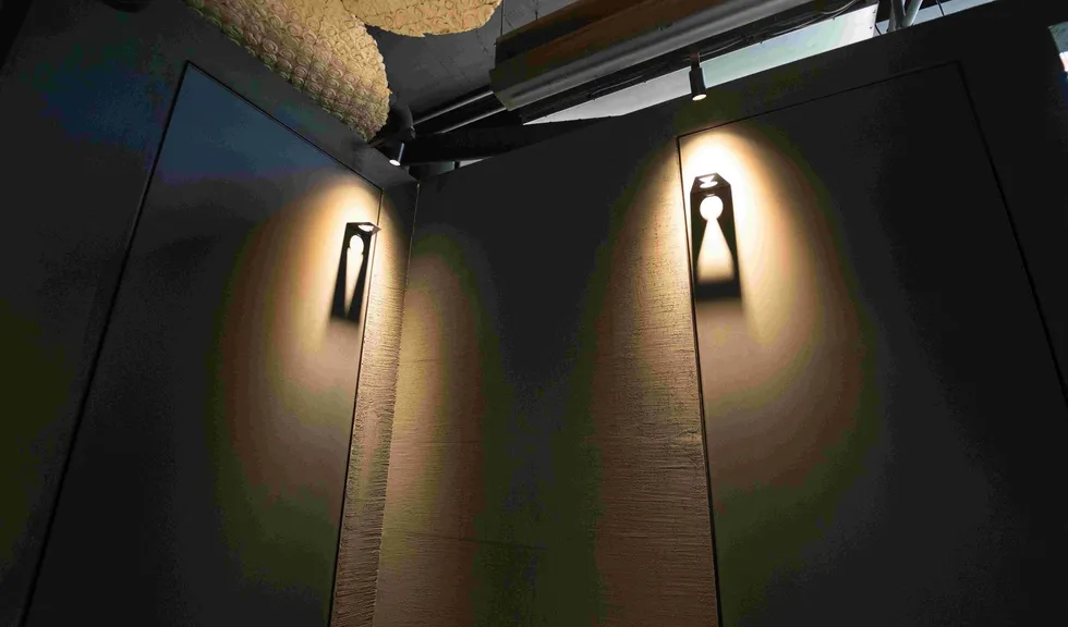 Нашлось место и для других креативных решений. Так, дизайнеры подсветили инсталляцию из… прессованных яичных сот на потолке. А символы, обозначающие санузел, выделяет игра света и тени.