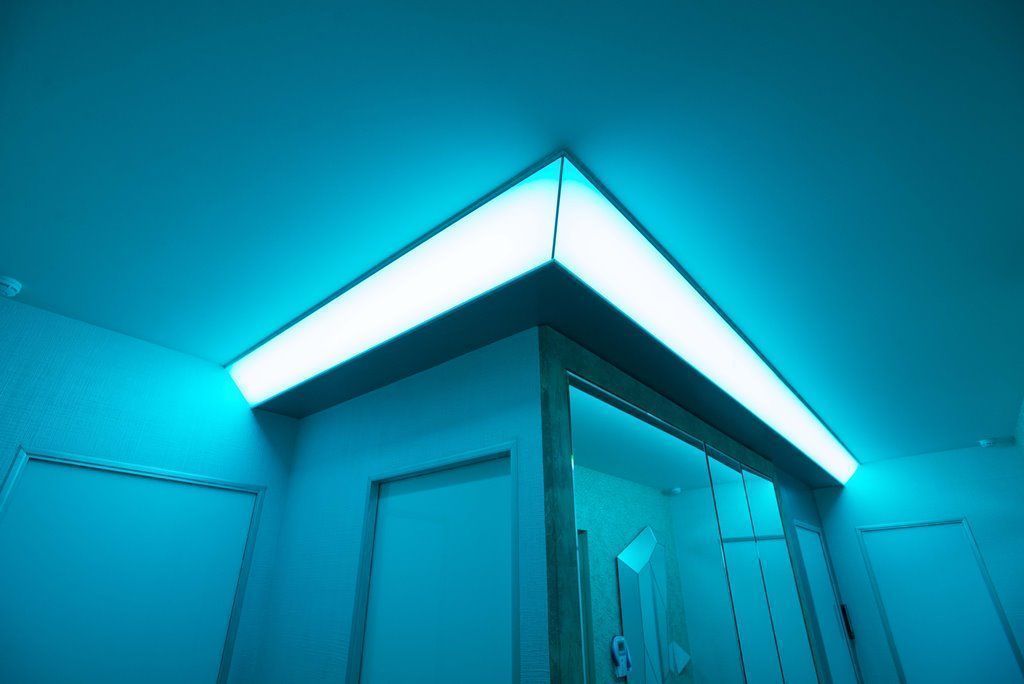 В прихожей освещение также строится на мягкой подсветке скрытой за матовыми пластиковыми панелями. Особенно интересно там смотрится смена цветов RGB-ленты arlight®, многократно отражающаяся в мозаике из зеркал.