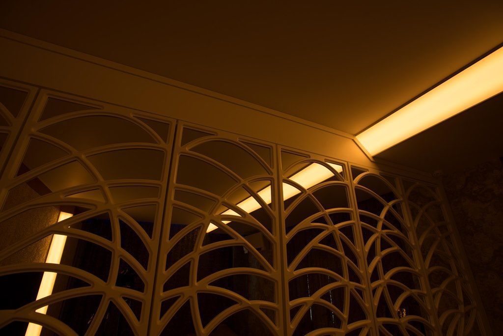 Основное освещение в гостиной, как уже было сказано, заключается в широкой светящейся полосе, расположенной на перепаде высот потолка. Конструкция выполнена таким образом, что примерно на треть комнаты, где располагается диван, свет не распространяется. Тогда как подсветка направлена на другую, более активную часть комнаты. Такой приём позволяет оградить зону отдыха от яркого света.