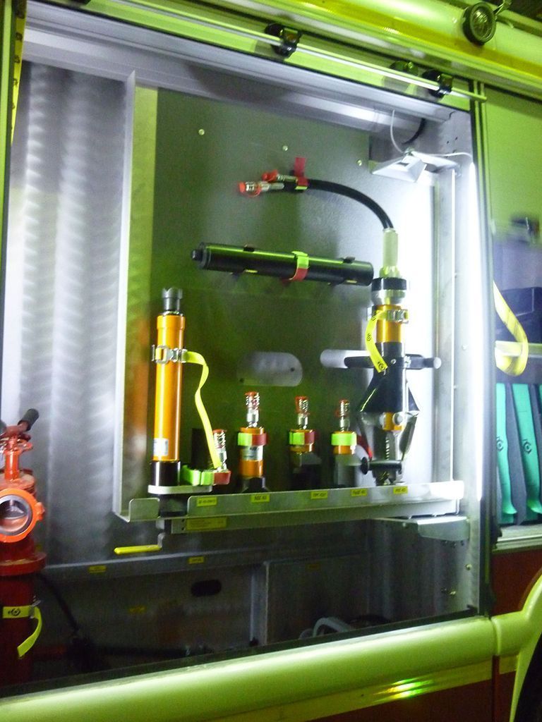 В них размещены инструменты, специальное оборудование, мостики для пожарных шлангов и сами пожарные шланги.