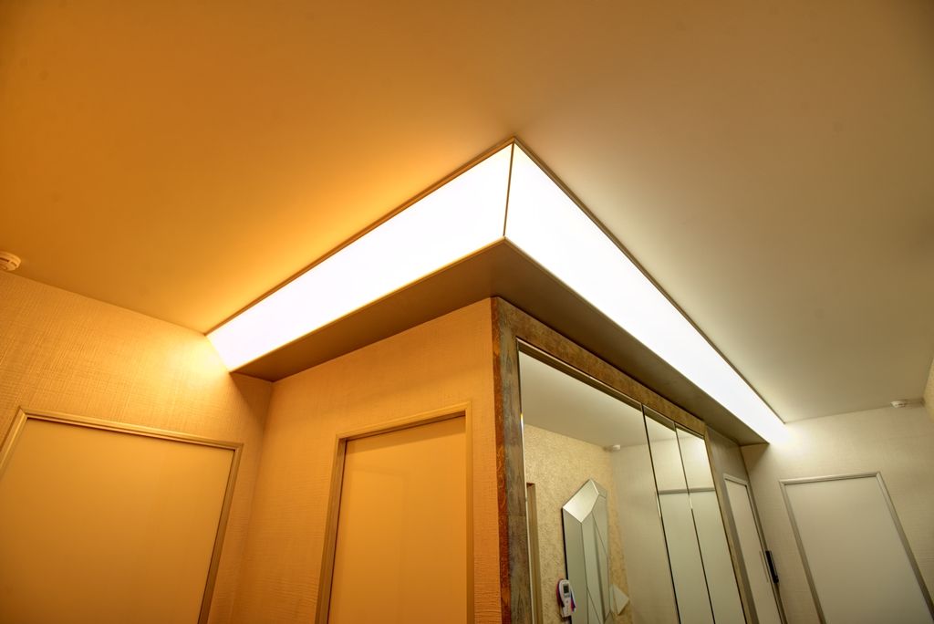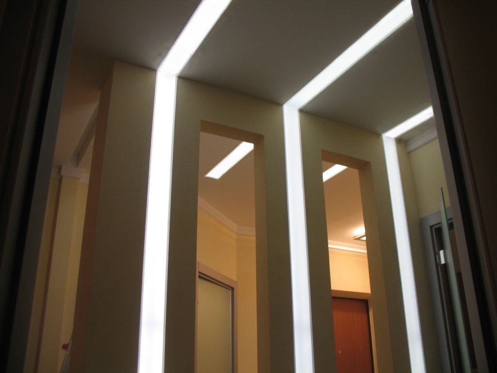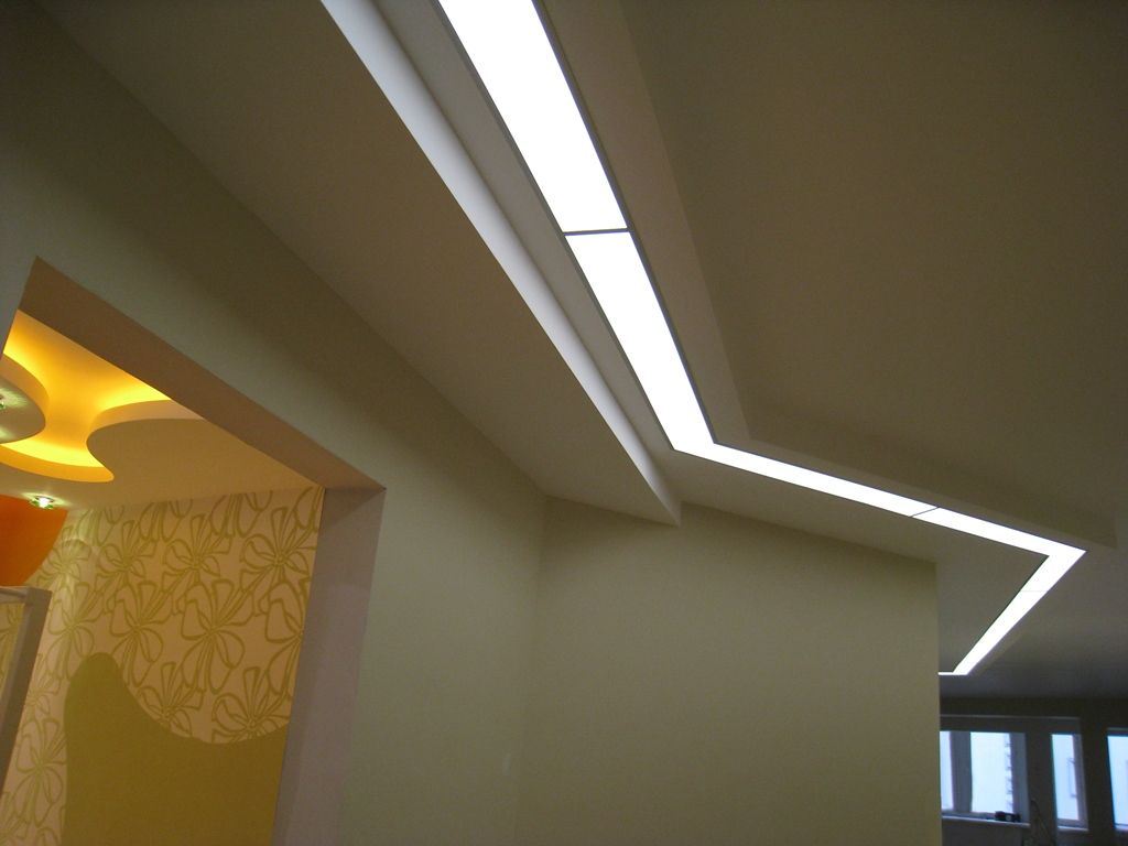 Второй вариант - это различные встроенные в гипсокартоновые ниши линейные светильники со светопропускающим пластиковым экраном или светильники, изготовленные из алюминиевого профиля со светодиодной лентой и закрытые экраном.