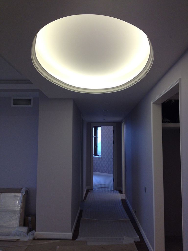 Для освещения прихожей и большого коридора были использованы встраиваемые светодиодные светильники arlight®. Они обеспечивают яркое освещение но при этом потребляют мало электроэнергии. В коридоре также была организована подсветка пола, для этого светодиодная лента была установлена в плинтус и затем закрыта матовым экраном для создания эффекта линий света.