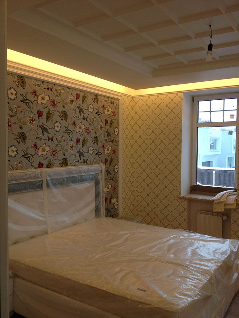 В спальных комнатах также использован тёплый белый оттенок свечения светодиодной ленты. Она была установлена по периметру комнат, в подвесном потолке, и свет распространяется через промежуток между потолком и стенами. Аналогичным способом была выполнена подсветка домашнего кинозала, отличие в том, что в нём применена светодиодная лента arlight® дневного белого свечения.